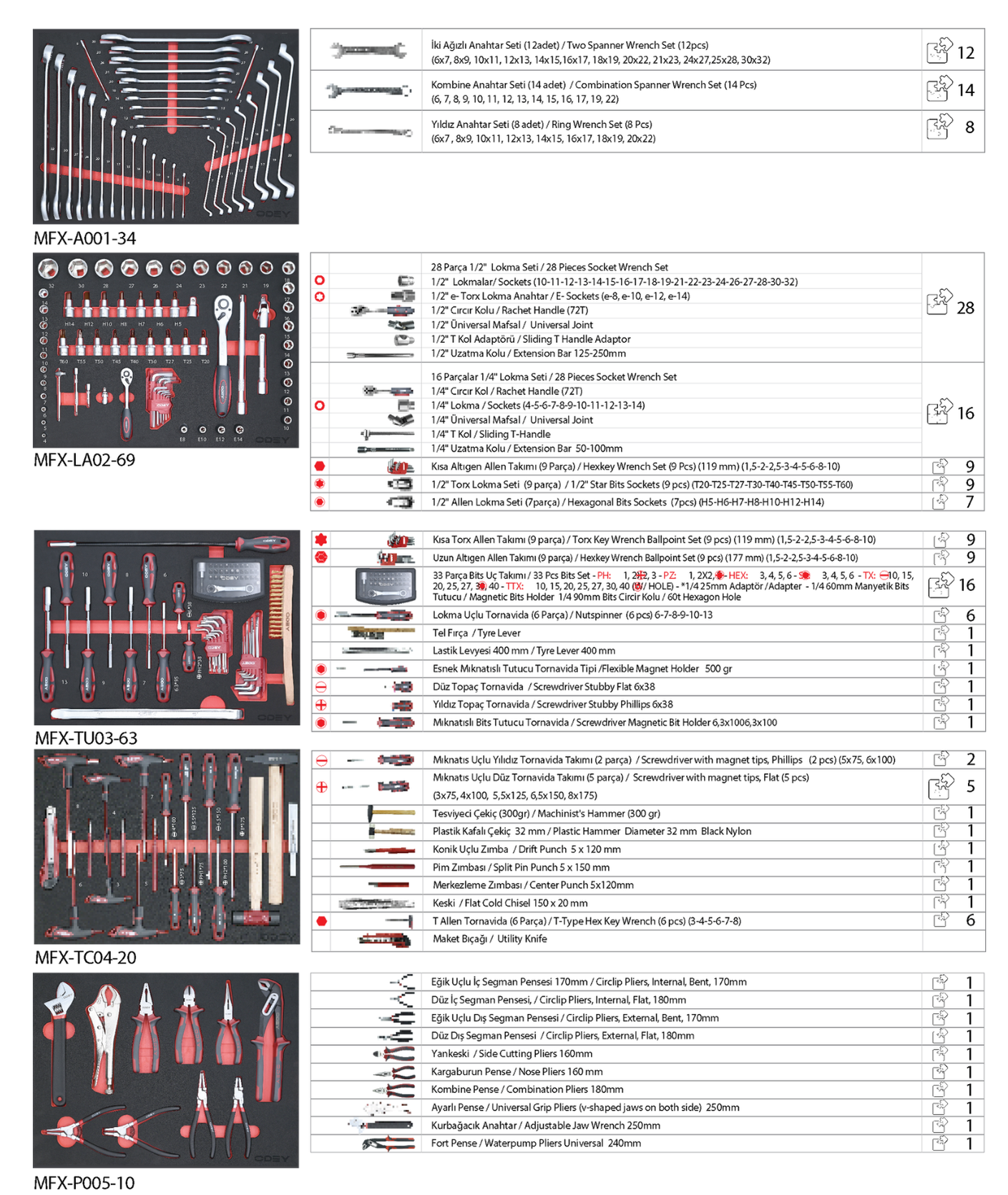 • 6 adet raylı çekmece (5’i tam donanımlı – toplam 196 parça takım)