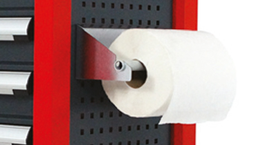 Yan panelindeki askı aparatları, plastik tutucular ve havlu kâğıt rafı gibi detaylarla her şeyin yeri bellidir. Üst tabla ise, çalışma anında malzeme bırakmak için özel bölmeli olarak tasarlanmıştır.